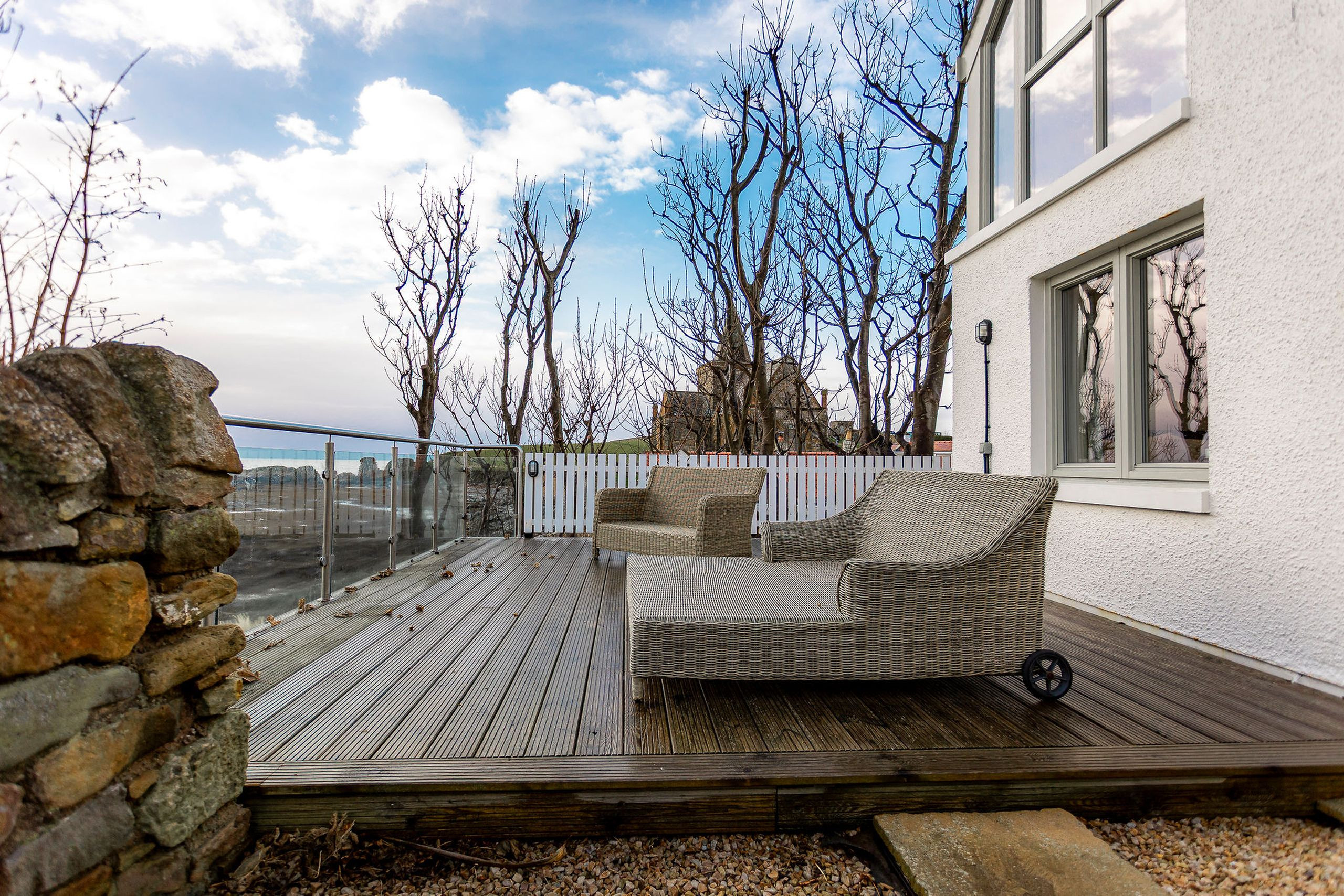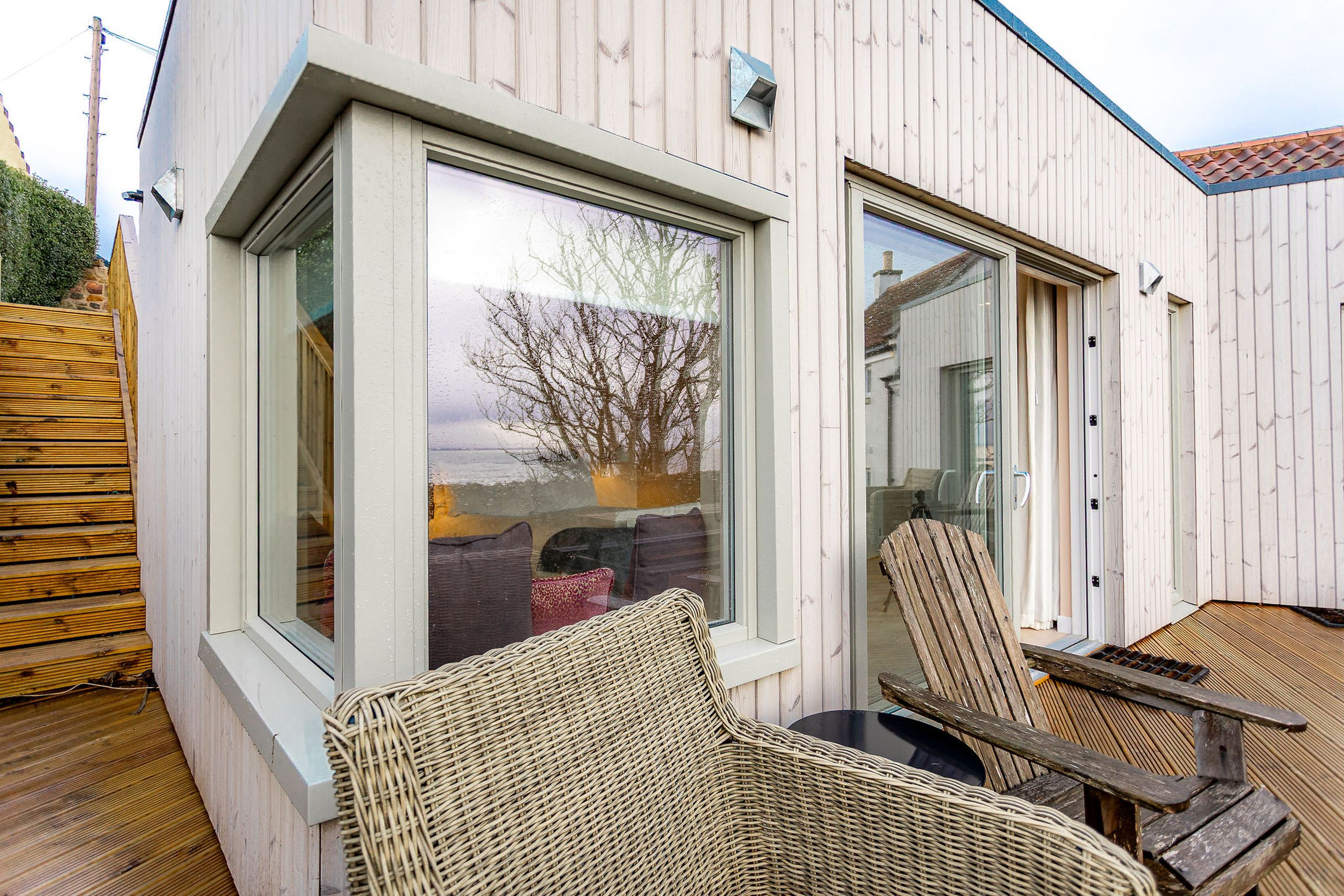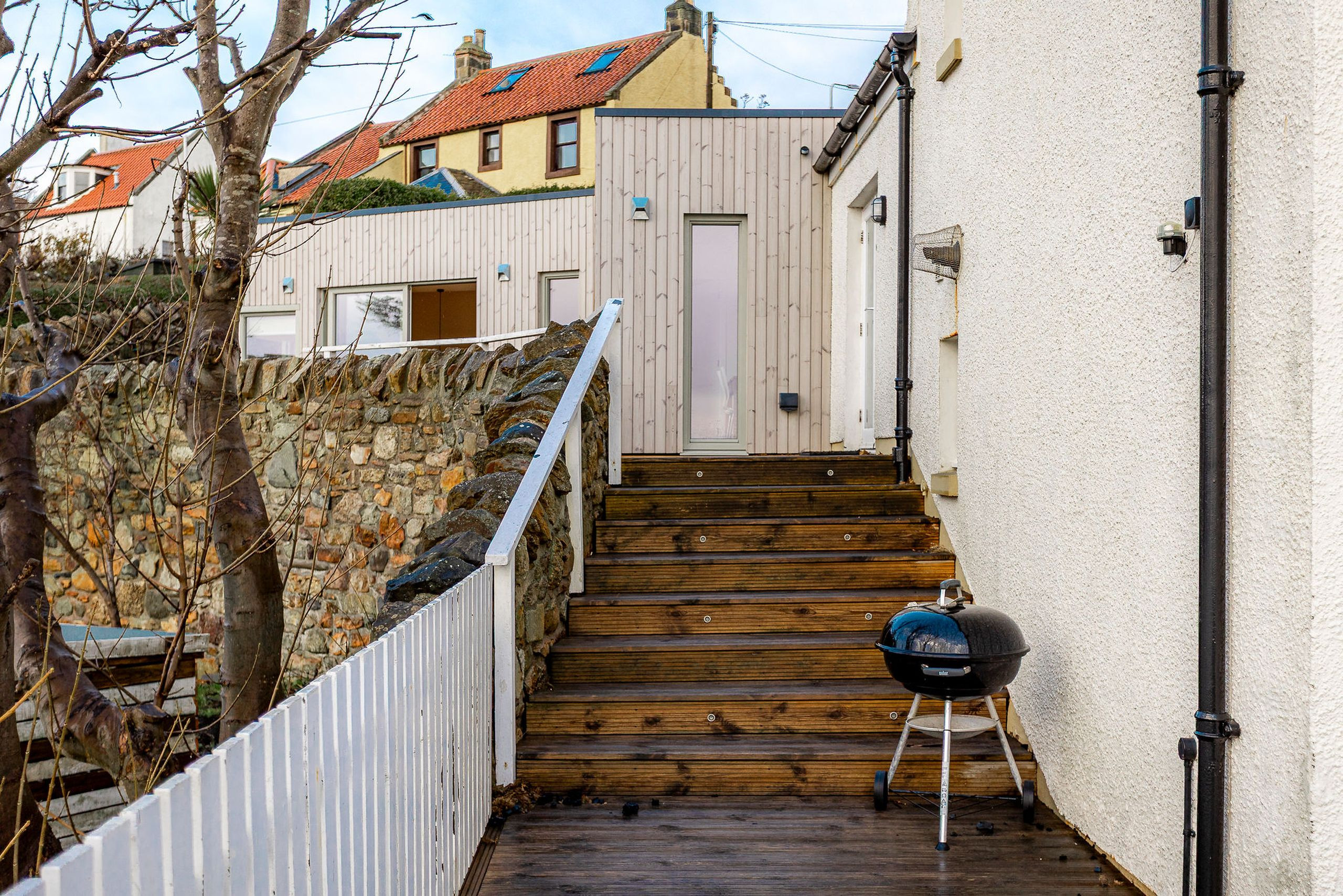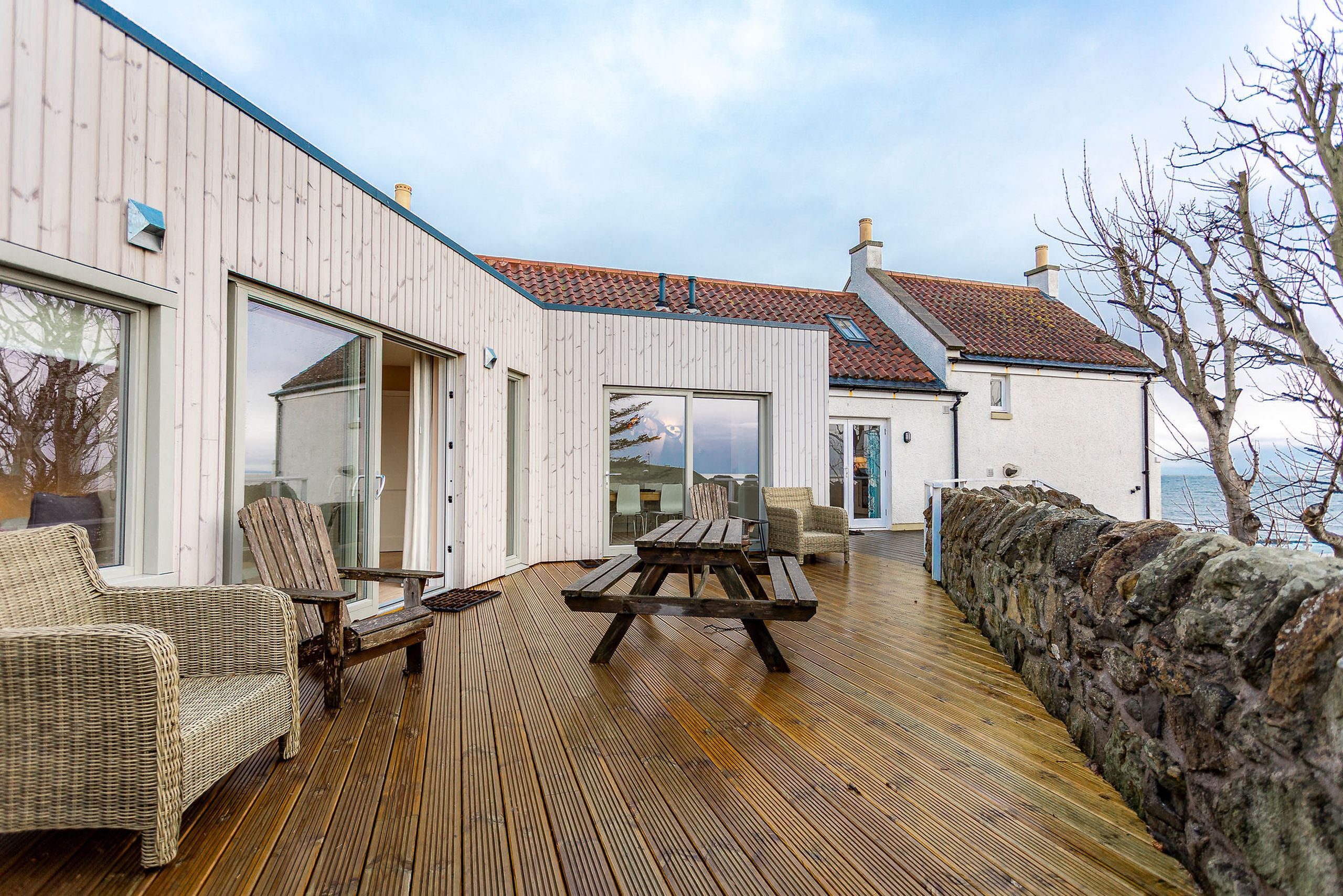 Outside provides lots of safe low maintenance space for family life: side and front patios for outdoor dining, a decking area that overlooks St Monans church, a large rockery and an upper garden area. A back gate opens directly onto the Fife Coastal Path, making beach walks and coastal adventures effortless for the whole family.
